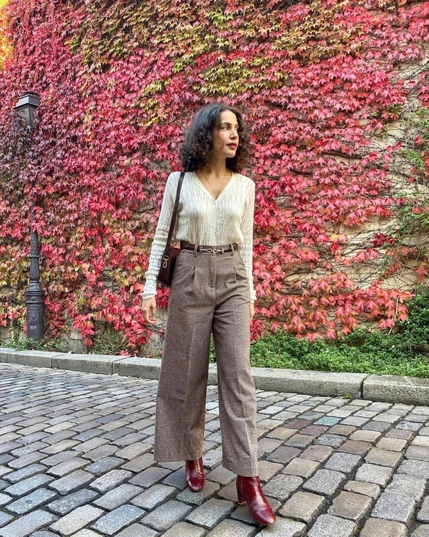 Quần âu họa tiết cũng là item rất đáng thử vì giúp set trang phục thêm nổi bật. Với kiểu quần họa tiết này, quý cô người Pháp kết hợp với áo cardigan trơn màu, boots đỏ để tạo nên outfit vừa hài hòa, vừa ấn tượng
